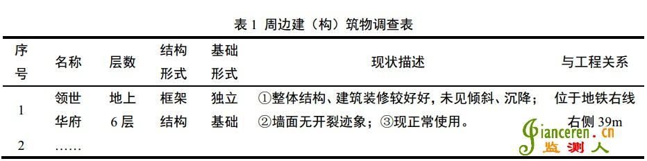 位于城市的工程往往對(duì)周邊環(huán)境的變形控制十分嚴(yán)格,因此對(duì)周邊建(構(gòu))筑物、管線等受關(guān)注對(duì)象的現(xiàn)狀應(yīng)在監(jiān)測(cè)工作前調(diào)查清楚。通常工程所關(guān)注的監(jiān)測(cè)對(duì)象包括:
