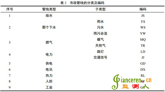 由于管線大多埋于地下,對(duì)于監(jiān)測(cè)單位很難對(duì)其進(jìn)行調(diào)查,僅能通過(guò)設(shè)計(jì)單位提供的綜合管線圖以及現(xiàn)場(chǎng)反饋的情況進(jìn)行了解。從監(jiān)測(cè)的角度來(lái)說(shuō),應(yīng)特別注意空間上與工程有緊密關(guān)系且有壓力的管線。市政管線的類型可參考下表。